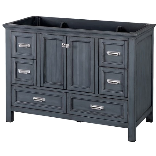 Bring the simplicity and warmth of farmhouse style into your bathroom with the Brantley Collection. The 48 in vanity cabinet features two soft close doors, one interior adjustable shelf and six full extension slow close drawers to maximize your storage space. With style elements such as a harbor blue finish and a beaded inlay on the doors, the Brantley Collection will help you bring the cozy farmhouse feel of the rest of your home right into the bathroom.