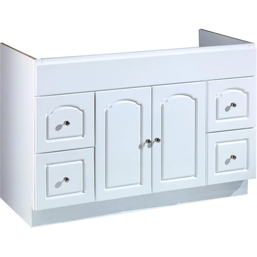 This Aspen vanity features a snow white, high gloss finish with coordinating satin nickel hardware and self-closing hinges. Doors and drawer fronts are made of ultra density fiberboard and side panels are plywood with a laminated interior. There are dual drawer glides for strength and a smooth glide. Cam lock construction for easy assembly.