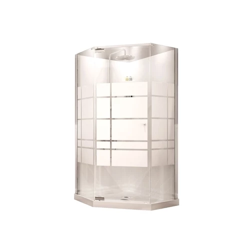 Neo-angle shower kit. Three-piece white polystyrene wall with 3 convenient shelves, textured base, easy-to-clean, silicone free, right or left installation pivot door, chrome finish, Soho glass. 1 year warranty.